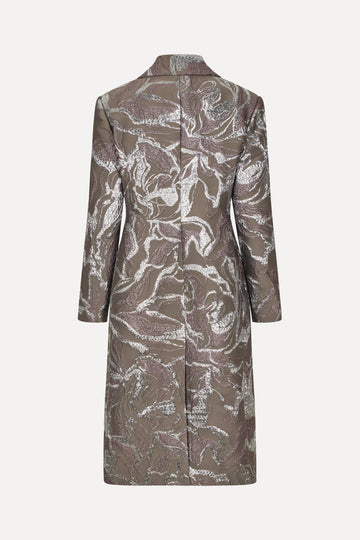 Lång jacquardvävd kappa med dubbelknäppt snitt, abstrakt metalliskt mönster, V-ringning med krage och höga slitsdetaljer. Detaljerad med sidfickor. Helt fodrad med STINE GOYA-logofoder.
