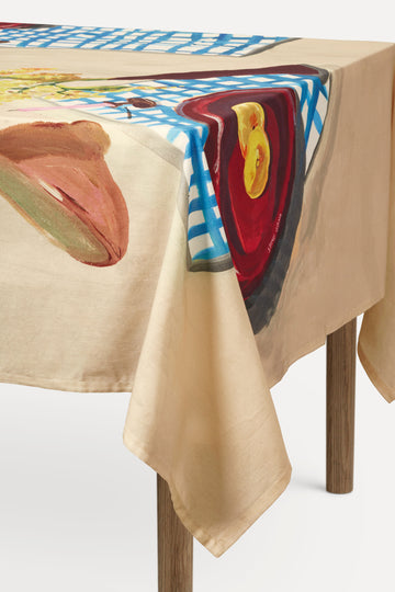Duk i 100% ekologisk bomull med handmålat print. Motivet visar ett konstnärligt dukat bord med citrusfrukter, keramik, blommor och baguetter placerade på ett klassiskt blåvitt rutmönster.