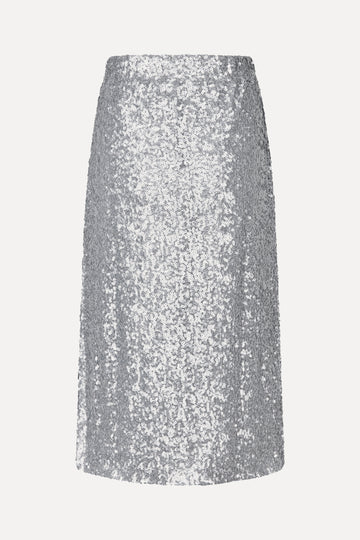 Silverfärgad paljettkjol med elastisk midja, högt slits i sidan och flera lager av underkjol för extra komfort