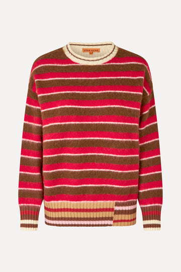 Stickad tröja med horisontella ränder i bruna, röda och rosa nyanser. Tröjan har en rund halsringning med kontrastkant samt ribbstickade kanter vid ärmsluten och nedtill. Tillverkad i en mjuk och varm kvalitet som garanterar komfort och en avslappnad passform.