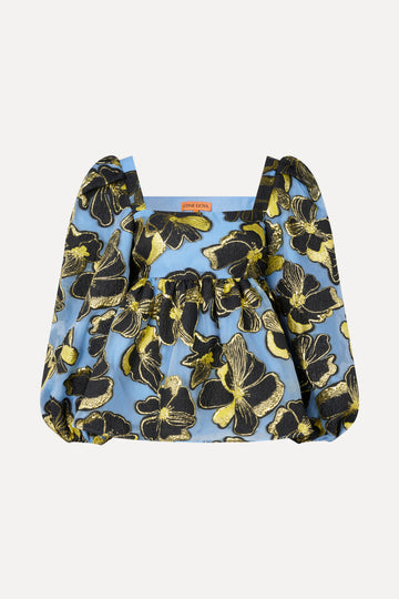 Vacker peplum-blus i Jacquard-vävd organza med abstrakt blommönsterprint och guldmetalliska detaljer. Blusen har en fyrkantig halsringning och långa puffärmar. Dold dragkedja i sidan.